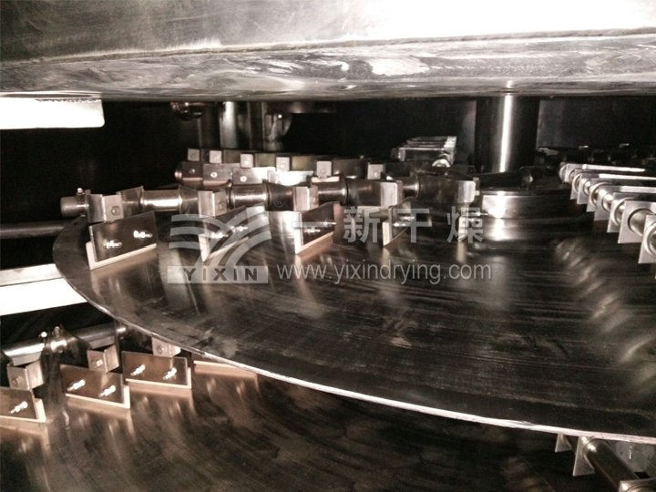 濕物料自加料器連續(xù)地加到干燥器上部一層干燥盤上,帶有耙葉的耙臂作回轉運動,使耙臂連續(xù)地翻抄物料。物料沿指數(shù)螺旋線流過干燥盤表面,在小干燥盤上的物料被移送到外緣,在大干盤上的物料向里移動并從中間落料口落入下一層小干燥盤中。大小干燥盤上下交替排列,物料得以連續(xù)地流過整個干燥器。中空的干燥盤內通入加熱介質,加熱介質形式有飽和蒸汽、熱水和導熱油,加熱介質由干燥盤的一端進入,從另一端導出。已干物料從^后一層干燥盤落到殼體的底層,^后被耙葉移送到出料口排出。濕汽從物料逸出,由設在頂蓋上的排濕口排出,真空型盤式干燥器的濕汽由設在頂蓋上的真空泵口抽出。從底層排出的干物料可直接包裝。通過配加翅片加熱器、溶劑回收冷凝器、袋式除塵器、干料返混機構、引風機等輔機,可提高其干燥的生產能力,干燥膏糊狀和熱敏性物料,可方便地回收溶劑,并能進行熱解和反應操作。