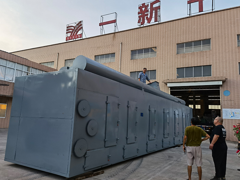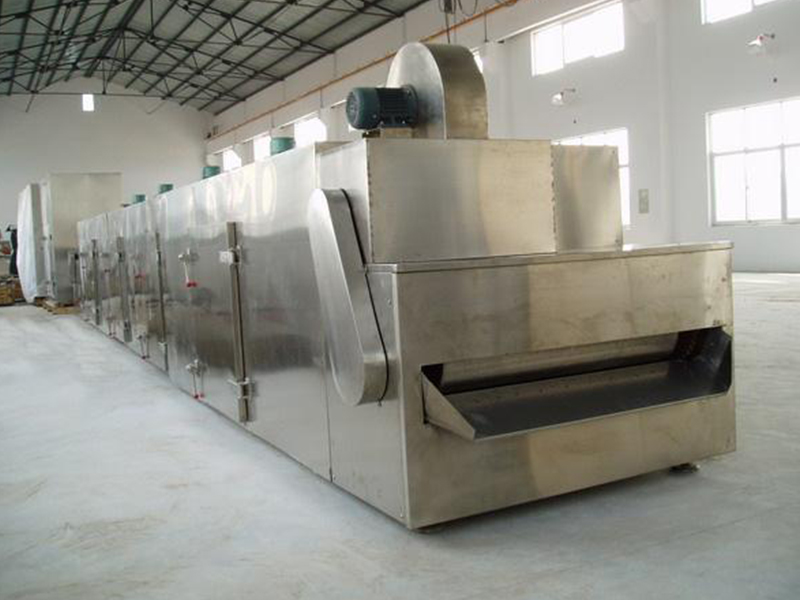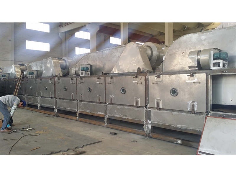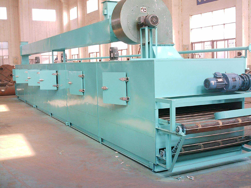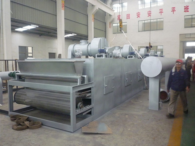 物料由加料器均勻地鋪在網(wǎng)帶上,網(wǎng)帶一般采用12-60目不銹鋼絲網(wǎng),由傳動裝置拖動在干燥機內(nèi)移動。干燥機由若干單元組成,每一單元熱風獨立循環(huán),部分尾氣由專門排濕風機排出,廢氣由調(diào)節(jié)閥控制,熱氣由下往上或由上往下穿過鋪滿物料的網(wǎng)帶完成熱量與質(zhì)量傳遞的進程,帶走物料水份。網(wǎng)帶緩慢移動,運行速度可根據(jù)物料溫度自由調(diào)節(jié),干燥后的成品連續(xù)落入收料器中。上下循環(huán)單元根據(jù)用戶需要可靈活配備,單元數(shù)量亦可根據(jù)需要選取。