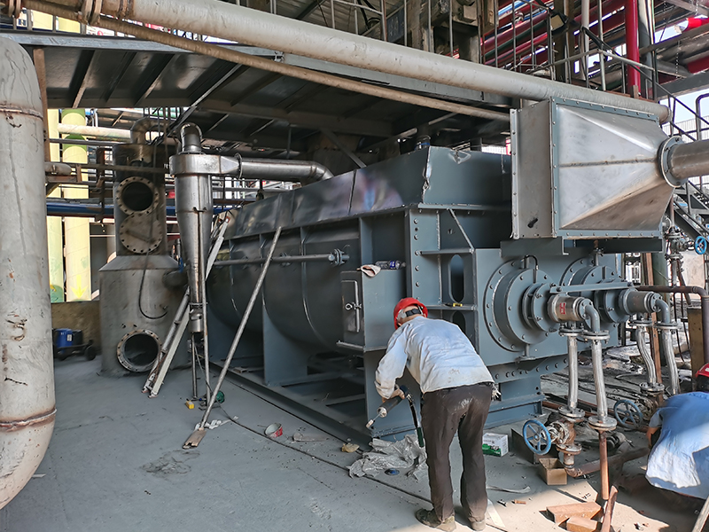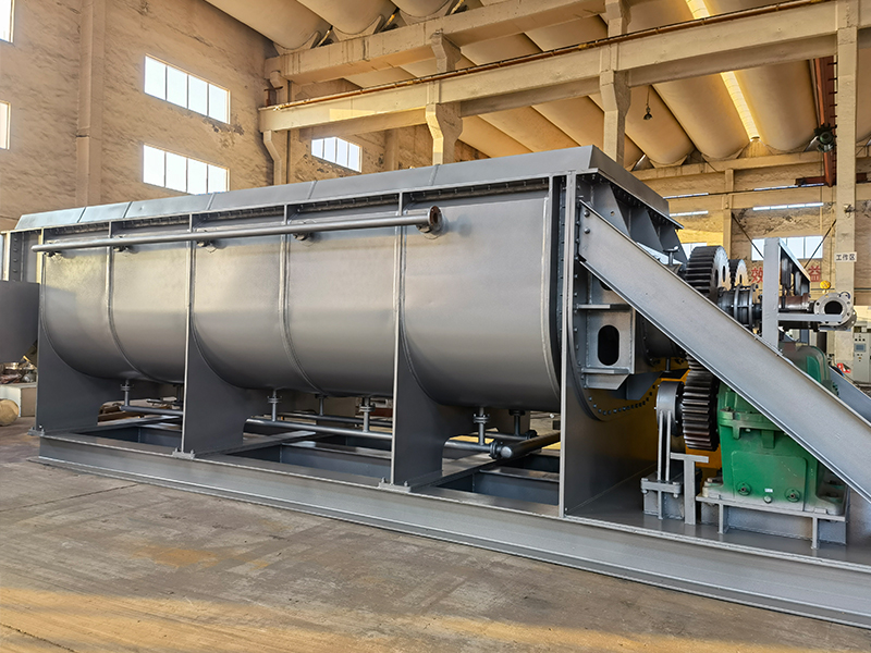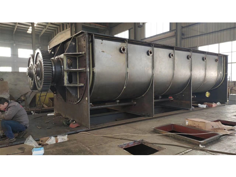 ??空心軸上密集排列著楔型中空槳葉,熱介質(zhì)經(jīng)空心軸流經(jīng)槳葉。單位有效容積內(nèi)傳熱面積很大,熱介質(zhì)溫度從-40℃到320℃,可以是水蒸汽,也可以是液體型:如熱水、導(dǎo)熱油等。間接傳導(dǎo)加熱,沒有攜帶空氣帶走熱量,熱量均用來加熱物料。熱量損失僅為通過器體保溫層向環(huán)境的散熱。楔型 槳葉傳熱面具有自清潔功能。物料顆粒與楔型面的相對運(yùn)動(dòng)產(chǎn)生洗刷作用,能夠洗刷掉楔型面上附著物料,使運(yùn)轉(zhuǎn)中一直保持著清潔的傳熱面。槳葉干燥機(jī)的殼體為W型,殼體內(nèi)一般安排二到四根空心攪拌軸。殼體有密封端蓋與上蓋,防止物料粉塵外泄及收集物料溶劑蒸汽。出料口處設(shè)置一擋扳,保證料位高度,使傳熱面被物料覆蓋而充分發(fā)揮作用。熱介質(zhì)通過旋轉(zhuǎn)接頭,流經(jīng)殼體夾套及空心攪拌軸,空心攪拌軸依據(jù)熱介質(zhì)的類型而具有不同的內(nèi)部結(jié)構(gòu),以保證傳熱效果。